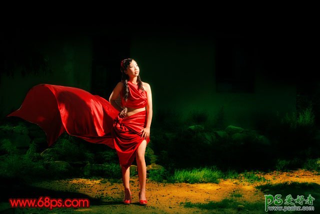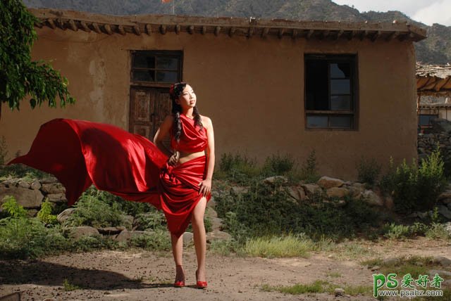PS美女照片调色教程实例,PS给漂亮的红裙美女照调出高对比度深红色,原图看起来有种古典的韵味,不过背景部分有点散乱,人物看起来不够突出。调色的时候可以把背景部分调暗,再适当加强一下人物周围部分的对比度,可更好的突出人物。