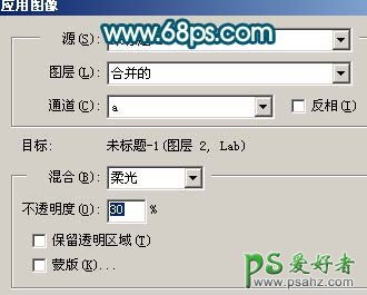 7、新建一个图层,按Ctrl + Alt + Shift + E 盖印图层,选择菜单:图像 > 模式 > Lab颜色,选择不合拼。然后执行:图像 > 应用图像,参数设置如图12,确定后选择菜单:图像 > 模式 > RGB颜色,选择不合拼,效果如图13。