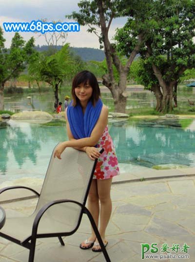 PS美女照片调色教程实例,photoshop给泳池边的少女玉照调出淡雅的青绿色,本教程的色调以青绿色为主,色调比较清淡;人物部分稍微用了一些淡红色,和背景衬托起来有种甜美时尚的味道。调色的时候完全可以按照自己的喜好去调。 最终效果 原图