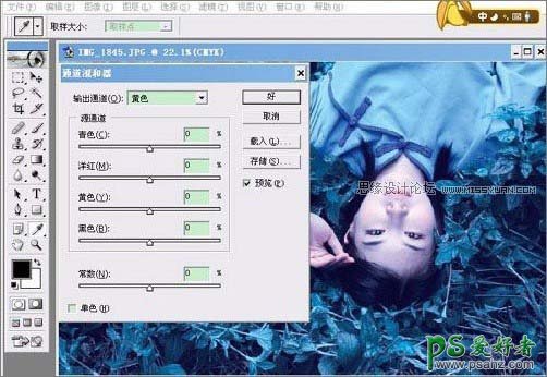 混合器。“输出通道”选取“黄色” 通道,将“黄色”的数据调节为0。(见下图)