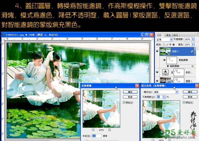 4、新建一个图层,盖印图层,转为智能滤镜。执行:滤镜 > 模糊 > 高斯模糊,参数设置如下图。确定后双击智能滤镜滑块。模式为“滤色”,降低不透明度。载入图层1蒙版选区,反选选区对智能滤镜的蒙蔽填充黑色。