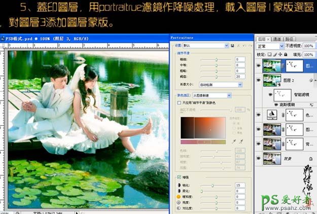 5、新建一个图层,盖印图层,用Portrature滤镜进行降噪处理。载入图层1蒙版选区,对图层3添加图层蒙版。