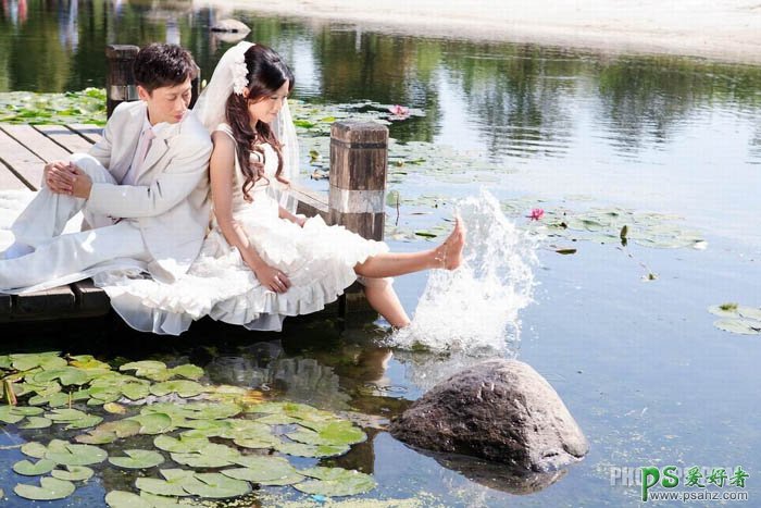 PS情侣婚片调色教程实例,ps给浪漫的翠绿色池景婚片情侣调出唯美色,碧水蓝天,花团锦簇这是理想的拍摄场景。不过生活中很少有。但我们可以通过后期的处理来实现。下面的教程将用最基础的调色工具调出漂亮的效果。