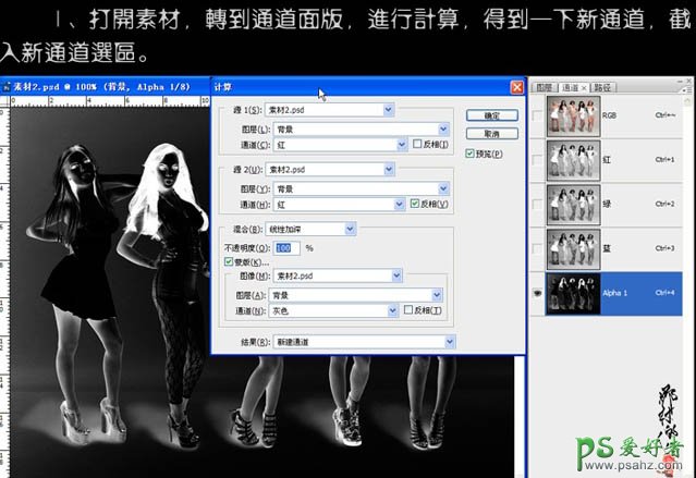 1、打开原图素材,点通道面板。选择红色通道,执行:图像 > 运算,参数设置如下图。确定后得到了Alpha 1 通道。按Ctrl + Alt + 4 调出选区。