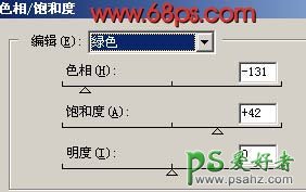2、创建色相/饱和度调整图层,对绿色进行调整,参数设置如图3,效果如图4。