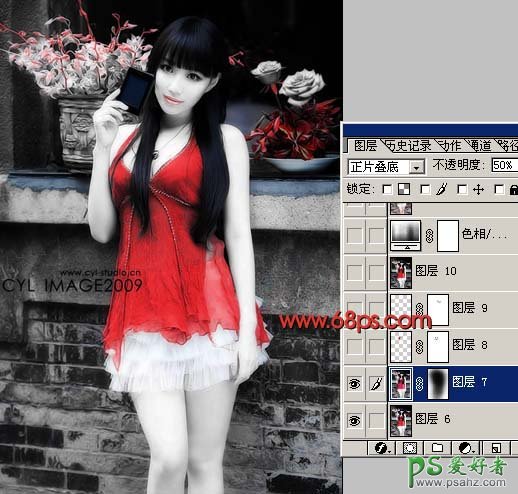 8、新建一个图层,盖印图层。执行:滤镜 > 模糊 > 高斯模糊,数值为5,确定后把图层混合模式改为“正片叠底”,图层不透明度改为:50%,加上图层蒙版,用黑色画笔把人物及周围部分擦出来,效果如下图。