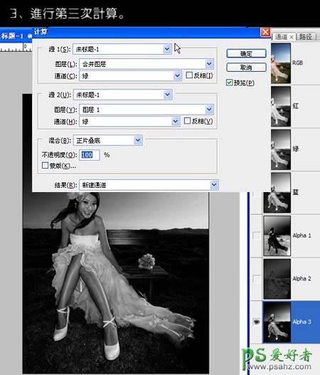 3、选绿色通道,执行:图像 > 运算,参数设置如下图,得到Alpha 3通道。