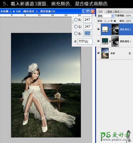 5、按Ctrl + Alt + 6 调出Alpha 3通道选区,新建一个图层填充颜色#f7f7dc,图层混合模式改为“颜色”。
