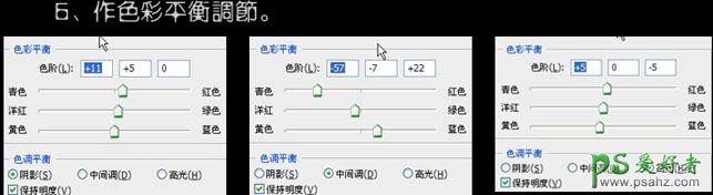 6、创建色彩平衡调整图层,参数设置及效果如下图。