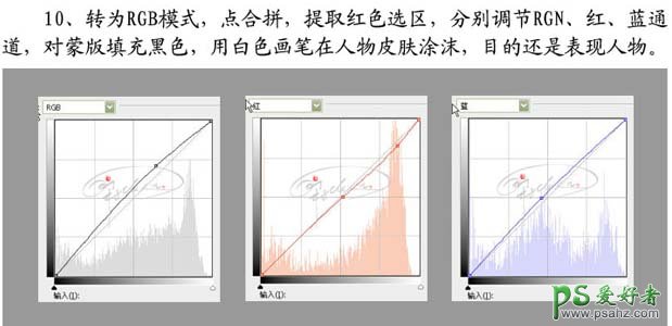 10、选择菜单:图像 > 模式 > RGB颜色,点合拼。按Ctrl + Alt + 1 调出红色选区,创建曲线调整图层,参数设置如下图。确定后把蒙版填充黑色,用白色画笔在人物皮肤上涂抹。