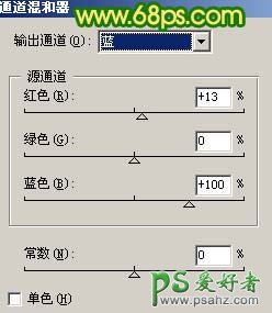 9、创建通道混合器调整图层,对蓝色进行调整,参数设置如图18,效果如图19。