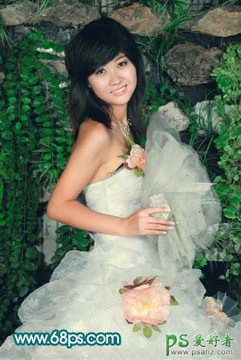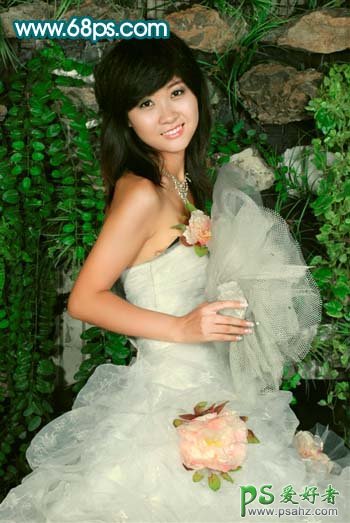 PS美女婚片调色教程,photoshop给纯美的少女婚纱照调出红润的皮肤色泽,本教程重点是给人物部分调色。素材图效果非常不错,只是色彩有点暗。人物部分色调有点单调。处理的时候可以按照自己的喜好给人物部分润色。背景只要稍微调整即可。 最终效果