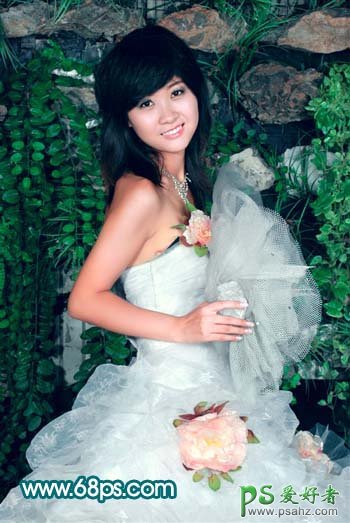 PS美女婚片调色教程,photoshop给纯美的少女婚纱照调出红润的皮肤色泽,本教程重点是给人物部分调色。素材图效果非常不错,只是色彩有点暗。人物部分色调有点单调。处理的时候可以按照自己的喜好给人物部分润色。背景只要稍微调整即可。 最终效果