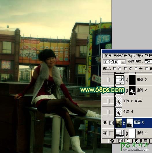 4、新建一个图层,盖印图层。执行:滤镜 > 模糊 > 高斯模糊,数值为5,确定后把图层混合模式改为“正片叠底”,图层不透明度改为:70%,加上图层蒙版,用黑色画笔把一些需要清晰的部分涂出来,如下图。