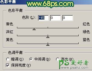 9、创建色彩平衡调整图层,参数设置如图15,确定后用黑色画笔把人物部分擦出来,效果如图16。