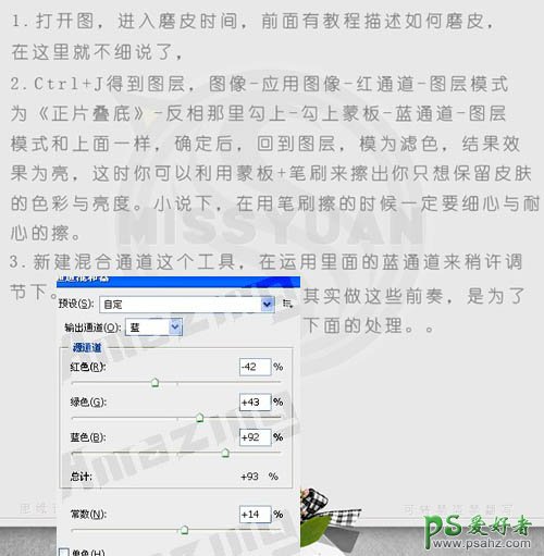1、打开原图素材,把背景图层复制一层,适当的给人物磨下皮。 2、按Ctrl + J 把当前图层复制一层,执行:图像 > 应用图像。参数设置:红通道,图层模式为“正片叠底”,勾选反相,再勾上蒙版:蓝通道,图层混合模式为“正片叠底”,结果效果为亮,这是你可以利用蒙版加笔刷来擦出你只要保留皮肤的色彩与亮度。 3、创建通道混合器调整图层,参数设置如下图。