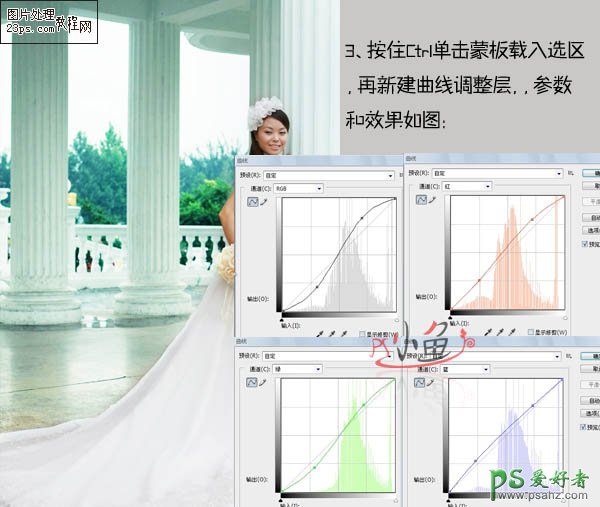 3、按住Ctrl单击蒙板载入选区,再执行图层<新建调整图层<曲线调整层,,参数和效果如图: