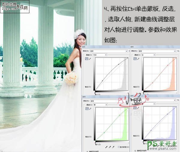 4、再按住Ctrl单击蒙板,反选,,选取人物,执行图层<新建调整图层<曲线调整层对人物进行调整。参数和效果如图: