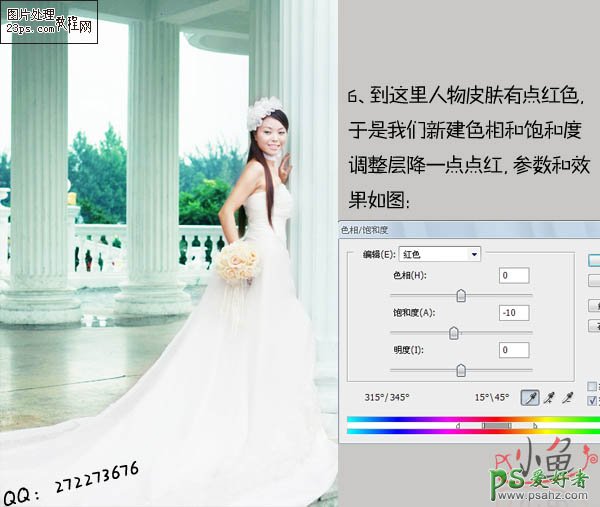 6、到这里人物皮肤有点红色,于是我们新建色相和饱和度调整层降一点点红,参数和效果如图: