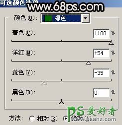 7、创建可选颜色调整图层,对绿色进行调整,参数设置如图14,效果如图15。