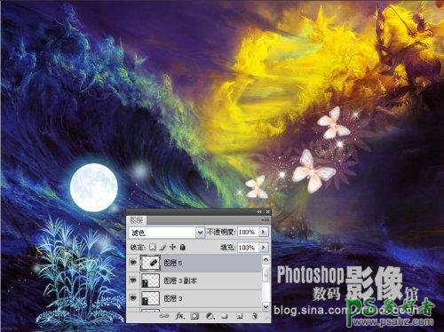 7、打开素材蝴蝶,并移至过来,放在画面的左侧,图层模式:滤色。将黑色屏蔽掉。