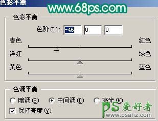 6、按Ctrl + B 调整色彩平衡,参数设置如图14,效果如图15。