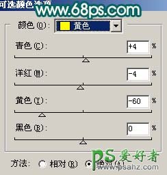 2、创建可选颜色调整图层,对黄色进行调整,参数设置如图3,效果如图4。
