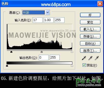5、创建色阶调整图层,参数设置如下图,目的是给
