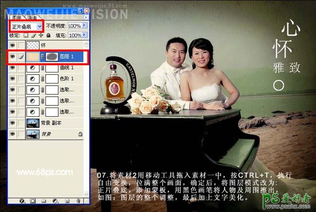 7、打开下图所示的纹理素材,拖进来,按Ctrl + T 适当调整大小,拉满整个画布。确定后将图层混合模式改为“正片叠底”。添加图层蒙版,用黑色画笔把人物及周围部分擦出来。最后调整下整体颜色,加上装饰文字,完成最终效果。
