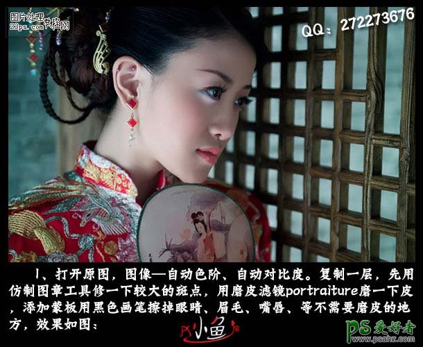 1、打开原图,图像—调整--自动色阶、自动对比度。复制一层,先用仿制图章工具修一下较大的斑点,用磨皮滤镜portraiture磨一下皮,添加蒙板用黑色画笔擦掉眼睛、眉毛、嘴唇、等不需要磨皮的地方,效果如图: