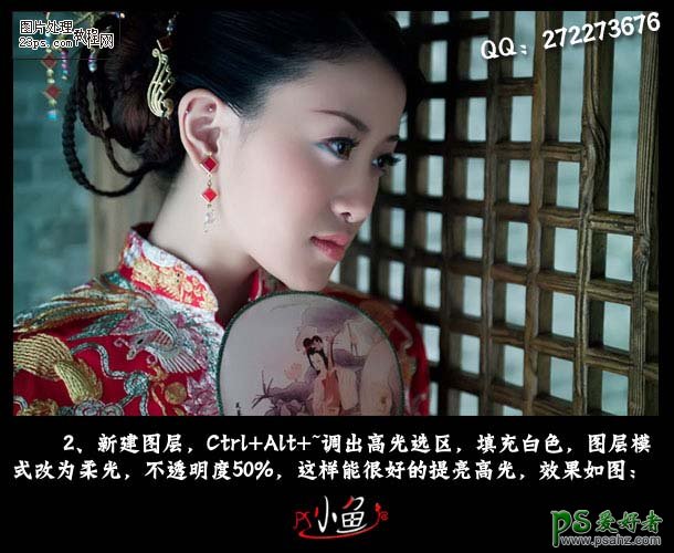 2、新建图层,Ctrl+Alt+~调出高光选区,填充白色,图层模式改为柔光,不透明度50%,这样能很好的提亮高光,效果如图: