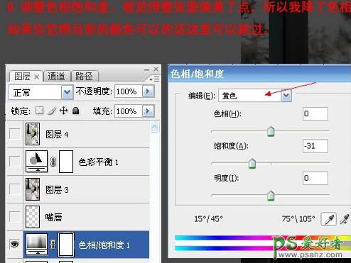 9、创建色相/饱和度调整图层,对黄色进行调整,适当降低饱和度,参数及效果如下图。