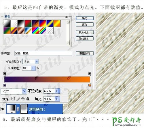 5、创建渐变映射调整图层,颜色设置如下图,确定后把图层混合模式改为“点光”,图层不透明度改为:65%,填充改为:33%,用灰色画笔把上半部分涂抹一下。