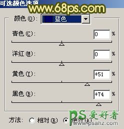 3、创建可选颜色调整图层,对蓝色进行调整,参数设置如图4,效果如图5。