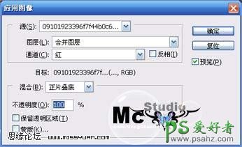 5、盖印图层,执行菜单命令,图像 > 应用图像,效果图与设置如下: