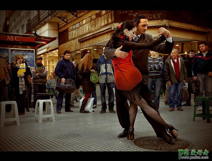 PS照片调色实例教程,photoshop给一对街舞情侣照调出漂亮的夜景效果,原图素材可能是傍晚的街道拍摄的,照片的光线还比较充足。为了体现出夜晚的味道。作者把图片的光线压暗了很多,局部的色调也换上了灯光的色调。总体感觉是在夜色下的场景,非常不错。