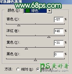 6、创建可选颜色调整图层,对绿色进行调整,参数设置如图9,效果如图10。