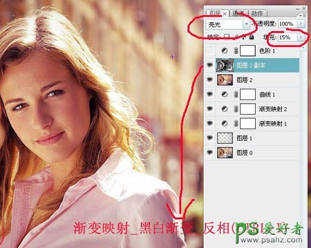 6、执行CTRL+J复制刚才盖印的那个图层,再对复制得到的图层执行图像-调整-渐变映射,设置黑白渐变,再执行CTRL+I反相,再把该层的混合模式设为亮光,填充为15%左右。