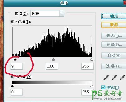 7、下面我们再创建一个色阶调整层,在RGB通道下把输入色阶设为9、1.00、255。