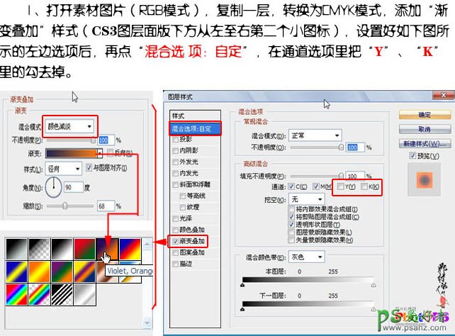 ,把背景图层复制一层,选择菜单:图像 > 模式 > CMYK模式,创建图层调成图层样式,选择“渐变叠加”,参数及效果如下图。