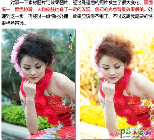 对照一些素材图片与效果图片,经过处理后的照片发生了很大变化,画面统一,颜色协调。人物皮肤也有了一定的改观。虚幻的点光背景效果很美。处理到这一步,再经过一点细化处理,效果应该很不错了。不过这离我们需要的结果相差甚远。