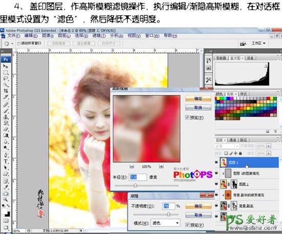 4、新建一个图层,盖印图层,执行:滤镜 > 模糊 > 高斯模糊,数值为7,然后按Ctrl + Shift + F 渐隐高斯模糊,在对话框里把模式设置为“滤色”,不透明度设置为:78%。