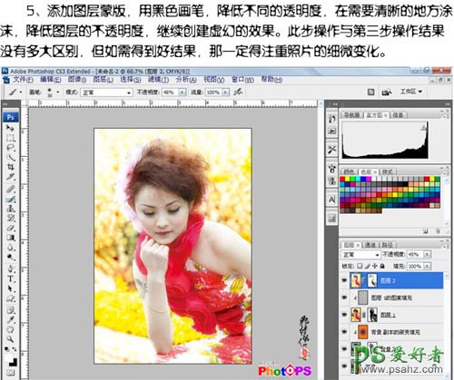 5、添加图层蒙版,用黑色画笔,降低不同的透明度,在需要清晰的地方涂抹,降低图层的不透明度。继续创意虚幻的效果。此步操作与第三步操作结果没有多大区别。但如需要到好结果,那一定得注重照片的细微变化。