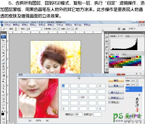 6、合并所有图层,选择菜单:图像 > 模式 > RGB颜色,复制一层,执行:滤镜 > 其它 > 自定,参数设置如下图。确定后添加图层蒙版,用黑色画笔在人物外的其它地方涂抹。此步操作是要变现人物通透的皮肤及增强画面的立体效果。
