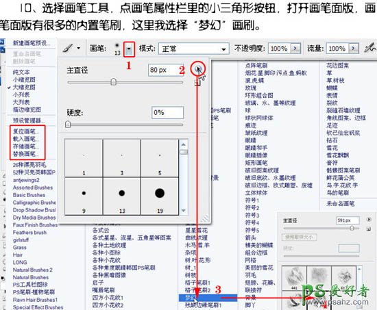 10、选择画笔工具,点画笔属性栏里的小三角形按钮,打开画笔面板,画笔版有很多的内置笔刷,这里我选择了“梦幻”画笔。