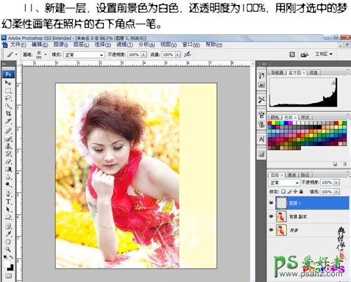 11、新建一个图层,把前景颜色设置为白色,不透明度设为:100%,用刚才选中的梦幻柔性画笔在照片的右下角点一笔。