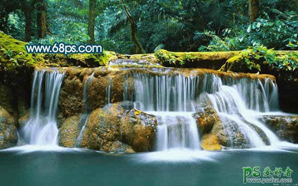 PS美女照片调色实例教程,photoshop给山间流水的风景照调出奇幻的色彩,原图素材色调比较单一,背景部分有点模糊。处理的时候首先需要把图片的色调调暗,局部不清晰的部分需要用加深工具加深,这样照片就会清晰很多。然后再整体调色,主色以深蓝色