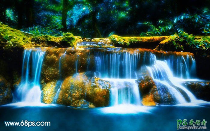 PS美女照片调色实例教程,photoshop给山间流水的风景照调出奇幻的色彩,原图素材色调比较单一,背景部分有点模糊。处理的时候首先需要把图片的色调调暗,局部不清晰的部分需要用加深工具加深,这样照片就会清晰很多。然后再整体调色,主色以深蓝色为主,也可以加上一些对比色。