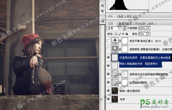 5、新建一个图层,还是用白色渐变,位置在画面的右上角也就是照射人物来那不的方向,图层填充改为:78%。