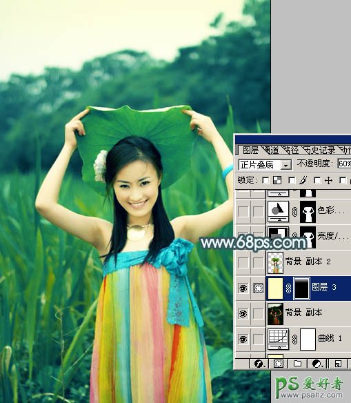 6、新建一个图层,填充颜色:#FCFBC0,图层混合模式改为“正片叠底”,图层不透明度改为:60%,加上图层蒙版,用黑白渐变拉出底部透明度效果如下图。
